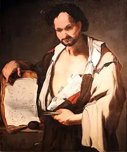 Born in Naples, Giordano was the son of the painter Antonio Giordano.[2] In around 1650 he was apprenticed to Ribera[3] on the recommendation of the viceroy of Naples[4] and his early work was heavily influenced by his teacher. Like Ribera, he painted many half-length figures of philosophers, either imaginary portraits of specific figures, or generic types.[5]