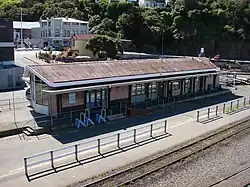The station building was a small wooden structure with a gabled roof, with dimensions of 16 by 35 feet (4.9 by 10.7 m). Trains were worked to the sides of ships for the transfer of cargo by means of wagon turntables, because the tracks in the station yard were at right angles to the wharves.[4] Access to the goods shed was provided by means of a traverser.[5]