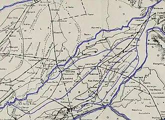 • The Sobraon branch continued south of Kahnuwan and turned southwest. Flowing parallel to the Sutlej River, it ended near Sobraon (to its north).