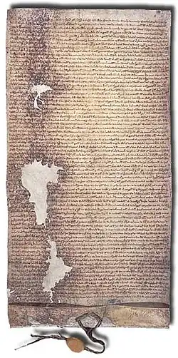 The Confirmatio Cartarum (Confirmation of Charters) was issued in Norman French by Edward I in 1297.[135] Edward, needing money, had taxed the nobility, and they had armed themselves against him, forcing Edward to issue his confirmation of Magna Carta and the Forest Charter to avoid civil war.[136] The nobles had sought to add another document, the De Tallagio, to Magna Carta. Edward I's government was not prepared to concede this, they agreed to the issuing of the Confirmatio, confirming the previous charters and confirming the principle that taxation should be by consent,[132] although the precise manner of that consent was not laid down.[137]