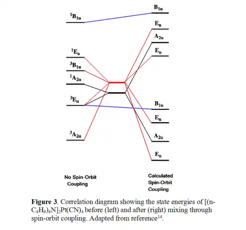 Mixing of all these singlet and triplet states will occur and is attributed to the spin orbit coupling of platinum 5d orbitals (ζ ~ 3500 cm−1), as shown in figure 3. The black lines on the figure indicate the mixing of 1A2u with 3Eu to give two A2u states. The red lines show the 1Eu, 3Eu, 3A2u, and 3B1u states mixing to give four Eu states. The blue lines indicate remnant orbitals after spin-orbit coupling that are not a result of mixing.