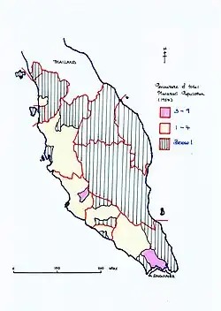 A map showing the distribution of the Malayali population in Malaya by district (excluding Singapore which contained approximately 27% of the Malayali population in Malaya (1957))