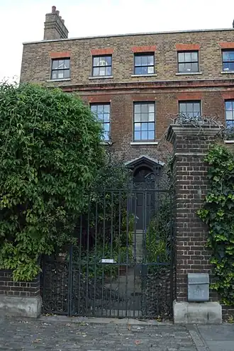 The four-storey house was built as one of three in 1742 by Thomas Andrews; only two of the houses survive to the present day.[1][2] A wealthy Jewish widow was the first occupier of the house, with the brewer Harry Charrington living there from 1794 to 1833 (Charrington Brewery had offices in the Mile End Road). Charrington greatly altered the house, and following his occupancy the house was subdivided, and shops built on the front garden.[3]