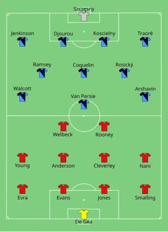 The match kicked off at around 16:00 GMT in front of a crowd of 75,448 at Manchester United's stadium, Old Trafford.[6] United opened the scoring in the 22nd minute, when Welbeck beat Djourou to a scooped pass from Anderson and headed the ball past Szczęsny.[6] Arsenal had a chance to level the scores five minutes later, when they were awarded a penalty for a foul on Walcott by Evans; however, De Gea correctly guessed the direction of Van Persie's penalty kick and pushed the ball around the post.[7] A minute later, Traoré could only clear a cross from Rooney as far as Ashley Young, who controlled the ball, shifted it onto his right foot and curled a shot into the top corner to score his first goal for Manchester United since signing from Aston Villa that summer.[8]