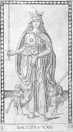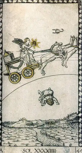 The name appears to be a mistaken confusion by later writers with the contemporary card-game of Tarocco, which includes many extra picture-cards. Mantegna Tarrochi were not used for card games or divination, but were likely educational tools for upper-class children, although no documentation of their use survives. Some sets bound up in book form at early dates survive (e.g. BNF, Paris, and Pavia), and all examples are printed on single sheets of thin paper.[1] Examples in Cincinnati and New York have traces of hand-colouring in gold, which is very rare in prints[2]