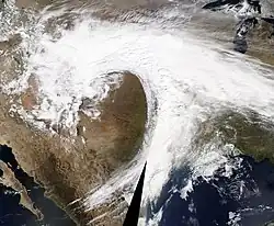 On March 4, a new extratropical low formed over the north central Pacific, within a larger extratropical storm. The system quickly split off from the parent low, and over the next couple of days, the storm moved southeastward while gradually intensifying, before reaching a peak intensity of 980 millibars (29 inHg) on March 6.[6] Afterward, the storm stalled off the coast of the Pacific Northwest for the next couple of days, while weakening, with the storm shedding its frontal system and weakening to 1,000 millibars (30 inHg) by 09:00 UTC on March 8.[7][8] On the next day, the storm slowly began to approach the West Coast, while developing multiple central lows in the process.[9] On March 10, the storm began moving ashore in California, while developing a new low-pressure center to the east, which became the dominant low by the next day, after the storm had moved inland.[10][11][12] The storm remained nearly stationary over the Western United States for another day, before resuming its eastward motion on March 12, as a disorganized storm system.[13] On the next day, the storm began approaching another system over the Central Plains while gradually strengthening, before merging with it early on March 14, with the winter storm organizing significantly and growing more powerful in the process.[14][15] On the night of March 13–14, a powerful low-level jet stream channeled large amounts of moisture from the Gulf of Mexico across the Southern Plains and into the storm, which enhanced precipitation from the storm and also contributed to the strengthening of the system.[1] On March 14, the winter storm developed a secondary low at the triple point of its occluded front, as the storm expanded in size. Later that day, the storm's central pressure reached a secondary peak of 998 millibars (29.5 inHg), while the storm was situated over the Central United States, with the center of low pressure being situated over southeastern Colorado.[16][17] For much of that day, the storm's central low remained nearly stationary, even as it was intensifying. The storm's cyclogenesis resulted in a tightening of the pressure gradient, which gave the storm a large and expansive wind field.[1]