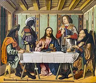 Several signed works are known, including the only two large altarpieces, both from churches in Cremona and now in the National Gallery, London.[3] Two versions of the Supper at Emmaus, adapted from a lost work by Giovanni Bellini known from a print, are in the Gemäldegalerie, Berlin and the Gallerie dell'Accademia in Venice, where there is also a Circumcision of Jesus in the Museo Correr, dated 1499. Including unsigned attributed works, there is a probable surviving oeuvre of about a dozen paintings;[1] apart from the wall-paintings lost in 1574, much of his painting may be among the large number of pieces assigned to the workshop of Giovanni Bellini. A small Adoration of the Magi, formerly in the Virginia Museum of Fine Arts, and only just attributed as an early work of Marziale's, was sold at Christie's, New York for $98,500 in January 2009.[4]