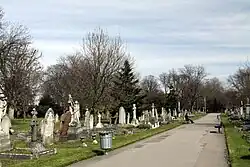 The cemetery contains a number of distinctive monuments, three of which are listed buildings. Most striking is the green bronze memorial to George Broad, who owned the foundry which made the Eros statue at Piccadilly Circus. Nearest Charing Cross Hospital, the Young family mausoleum is a single-storey building in Gothic architecture style.[3] The third listed grave is that of an Australian gold prospector, with a bas relief of him, opposite the Young family mausoleum.