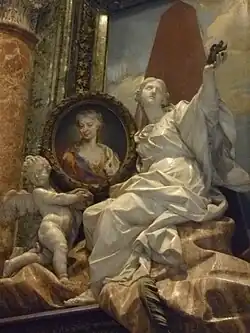 Her health was weakened by her ascetic life style and deteriorated as the years went by.[5] Maria Clementina died at the early age of 32 on 18 January 1735. Her doctor named the cause of death as 'scorbutic disease', more commonly known as scurvy.[6] She was interred with full royal honours in St. Peter's Basilica in Rome. Pope Clement XII ordered that she have a state burial. Pope Benedict XIV commissioned architect Filippo Barigioni to design a monument for her memory, Pietro Bracci sculpted a statue for it, and it was erected 1742 in the Basilica.