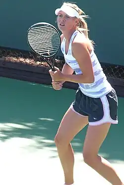 In the semifinals of the Tier I Pacific Life Open, Sharapova was defeated by Lindsay Davenport, the first time she had failed to win a game in a match.[38] She defeated former world No. 1 players Justine Henin and Venus Williams to reach the final at the Tier I NASDAQ-100 Open, where she lost to Kim Clijsters.[39][40]