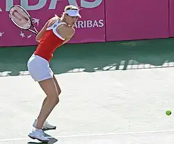 In May, Sharapova regained the world No. 1 ranking because of Henin's sudden retirement from professional tennis and request to the WTA that her own ranking be removed immediately.[75] As the top-seeded player at the French Open, Sharapova was within two points[76] of being knocked out by Evgeniya Rodina in the first round, before eventually winning.[77] As a result of losing to eventual finalist Dinara Safina in the fourth round (after serving for the match),[78] she relinquished her No. 1 ranking.[79] Her dip in form continued at Wimbledon, where she lost in the second round to world No. 154 Alla Kudryavtseva.[80] This was her earliest loss at Wimbledon, and at any Grand Slam in almost five years.[81]