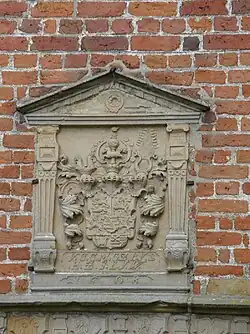 Maria's coat-of-arms as of 1608 on St. Jacobi Church in Cuxhaven. Abbreviated inscription: V.[on] G.[ottes] G.[naden] M.[arie] G.[eborene] Z.[u] B.[raunschweig] U.[nd] L.[üneburg] – 2nd line – H.[erzogin] Z.[u] S.[achsen,] E.[ngern] V.[nd] W.[estfalen] (trl. Of God's Grace Mary née of Brunswick and Lunenburg – 2nd line – Duchess of Saxony, Angria and Westphalia).