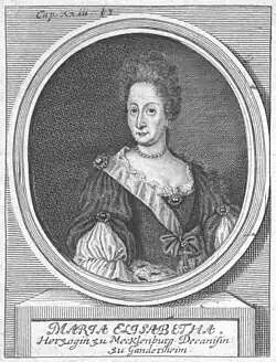 Marie Elisabeth, Duchess of Mecklenburg (24 March 1646 - 27 April 1713) was a princess of Mecklenburg-Schwerin. In 1712, following the unplanned late pregnancy and ensuing resignation of the formidable incumbent, Henriette Christine of Braunschweig-Wolfenbüttel, Marie Elisabeth became Princess Abbess of Gandersheim Abbey, but she died the next year.[1][2][3]