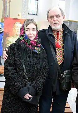 ![]() The artist Maria Tymchuk with her father, the Merited Painter of Ukraine Mykola Shevchuk, during the All-Ukrainian art plein air event "To You, Mother of God!" at the Zarvanytsia Spiritual Center (2023) | |