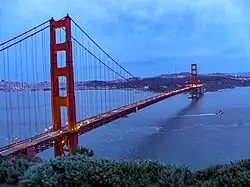 The Marin Headlands are a hilly peninsula at the southernmost end of Marin County, California, United States, located just north of San Francisco across the Golden Gate Bridge, which connects the two counties and peninsulas. The entire area is part of the Golden Gate National Recreation Area. The Headlands are famous for their views of the Bay Area, especially of the Golden Gate Bridge.