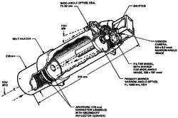 The imaging system, the Television Photography Experiment, consisted of two 15 centimeters (5.9 in) Cassegrain telescopes feeding vidicon tubes.[30] The main telescope could be bypassed to a smaller wide angle optic, but using the same tube.[30] It had an 8-position filter wheel, with one position occupied by a mirror for the wide-angle bypass.[30]