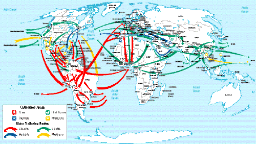 The routes for the traffic of drugs to the United States and Western Europe, the main markets for drugs produced in Latin America are three: the Pacific route, the Caribbean route, and the Atlantic route. Drug trafficking organizations continue making stops in different countries of Central America or to replenish or to transport it by land the product to the US-Mexico border in its direct routes to the United States.[8] In their routes to Europe they sail to the Caribbean where they transship the narcotics to commercial boats or vessels with greater reach which have direct routes to the main ports of entry in Europe like ones in Netherlands and Belgium in the North and Spain and Portugal in the South.[9] Also, there have been reports of drugs seizures in the ports of United Kingdom and Ireland.[10]