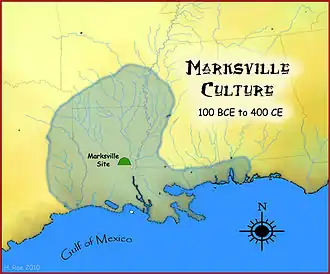 The Marksville culture was an archaeological culture in the lower Lower Mississippi valley, Yazoo valley, and Tensas valley areas of present-day Louisiana, Mississippi, Arkansas,[1] and extended eastward along the Gulf Coast to the Mobile Bay area,[2] from 100 BCE to 400 CE. This culture takes its name from the Marksville Prehistoric Indian Site in Avoyelles Parish, Louisiana. Marksville Culture was contemporaneous with the Hopewell cultures within present-day Ohio and Illinois. It evolved from the earlier Tchefuncte culture and into the Baytown and Troyville cultures,[3] and later the Coles Creek and Plum Bayou cultures. It is considered ancestral to the historic Natchez and Taensa peoples.[4]