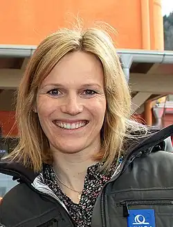 Born in Admont, Styria, Schild initially preferred the downhill event. However, by the age of 19 she had already undergone five knee surgeries, prompting her to concentrate on the less dangerous slalom and giant slalom competitions.[2][3] Since 2004, she has finished every season (except 2009 when out with injury) among the top 3 in the World Cup slalom standings, and won the slalom trophy in 2007, 2008 and 2011.[4] Her best result in the overall competition was a second place in 2007, when she lost the overall trophy only in the last two races (slalom and giant slalom) against compatriot Nicole Hosp, after having taken the lead with a second place in downhill and a third place in super-G on the first two days of the World Cup final 2007 in Lenzerheide.