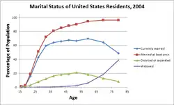 In 2004 the U.S. Census Bureau measured the marital status of U.S. residents, showing several trends.[24][25] While about 96% of residents in their 70s and 80s were married at least once, many were widowed due to the death of their spouses. In addition, a large portion of middle-aged Americans are either divorced, legally separated, or informally separated. Of those who were "separated or divorced," approximately 74% were legally divorced, 15% were "separated," and 11% were listed as having an "absent spouse."