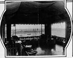 The mansion also featured a Chinese temple room which reconstructed a 5th-century Chinese temple and included a more-than-500-year-old mandarin bed which had once belonged to a Chinese princess. The Chinese temple room was said to have cost $87,000.[3][6][7][8] In the mansion, Marshall built nautical-themed bar which featured portholes with a moving replica of the sea which mimicked rocking of a boat at sea. This space would inspire a bar which Marshall would later design for the Edgewater Beach Hotel. The mansion also featured a reconstructed room taken from a convent. The mansion also included a small cafe room with a table which bore the autographs of many of the prominent visitors to the mansion.[7] The mansion also contained a studio/drawing room.[8][6] This space featured a high ceiling and a stage. Underneath the stage was storage space for tables which could be rolled out in order to transform the architecture studio workspace into a banquet hall.[8] Serving as a backdrop curtain to the stage was a tapestry which Louis XIV once presented to Madame de Pompadour.[6] The home also housed an architectural studio and office for Marshall when he lived there, which was housed in its street-facing front side.[6]