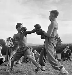 The International Boxing Association was established in 1920. World Fencing Championships have been held since 1921.[26] As Western influence grew in Asia a greater number of military personnel spent time in China, Japan and South Korea during World War II and the Korean War and were exposed to local fighting styles. Jujutsu, judo and karate first became popular among the mainstream from the 1950s–1960s. Due in part to Asian and Hollywood martial arts movies, most modern American martial arts are either Asian-derived or Asian influenced.[27] The term kickboxing (kikku bokushingu キックボクシング) was created by the Japanese boxing promoter Osamu Noguchi for a variant of muay Thai and karate that he created in the 1950s. American kickboxing was developed in the 1970s, as a combination of boxing and karate. Taekwondo was developed in the context of the Korean War in the 1950s.