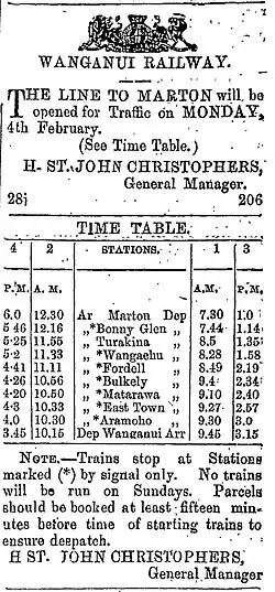 - ^ "OPENING OF THE RAILWAY. WANGANUI HERALD". paperspast.natlib.govt.nz. 18 May 1877. Retrieved 24 January 2021.