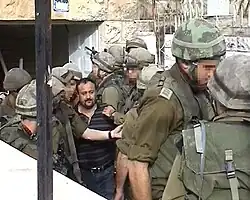Barghouti was captured on 15 April 2002 by Israeli soldiers, who had disguised their journey to his location by hiding in a civilian ambulance.[24] He was transferred to the Moscovia Detention Centre. On 18 April, Barghouti was reported to have declined to cooperate with his interrogators, and allowed to communicate freely with his lawyer. He was then denied the right to see his lawyer for the next month, except for an occasion on which they were not allowed to discuss the investigation.[6] The next time he was able to talk freely with his lawyer, Barghouti described having been subject to severe sleep deprivation and insufficient food. He described the torture, in the form of the shabeh method, in a later book, 1000 Days In Solitary Jail.[25] He said that he was forced to sit on a chair with nails protruding into his back for hours at a time.[25] Simon Foreman, the lawyer commissioned by the Inter-Parliamentary Union to report on the trial, has said "the witnesses whose statements were used to accuse [Barghouti], many of them made the same kind of statements and those allegations were disregarded, openly disregarded by the courts."[6][7] Barghouti has also stated that the interrogators threatened to kill him and his eldest son.[6] He has written that during his pre-trial detention, in addition to Moscovia, he was held for periods at Camp 1391 and the Petah Tikva prison.[25]