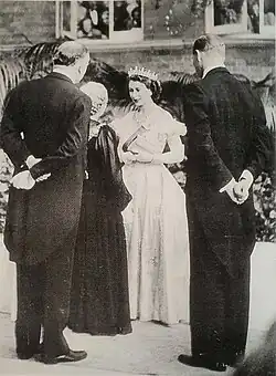 There were some dark moments when, for example, in June 1949 Fisher attended a radiographers' conference in which the speaker voiced the contemporary fear of a World War III and the atomic bomb.[36] In August 1949, Fisher was involved in some controversy, when she objected to a noisy greyhound racetrack being opened by a local window cleaner in peaceful Harrogate.[37] She condemned the proposals as "not quite the right thing for Harrogate".[38] However the position of mayor had some light-hearted moments, for example when in August 1949 Fisher presented the prizes for the Yorkshire beauty queen competition at the Royal Baths, Harrogate, and two of the top three finalists were Harrogate women.[39] It was the mayor's job to crown the new beauty queen in September of that year,[40] when the Bradford Observer reported: "One of the most attractive scenes [of the gala] was the crowning by the mayor (councillor Mrs Mary Fisher) of the Yorkshire Beauty Queen".[41] Another pleasant event for Fisher and her mayoress was an invitation to attend the wedding of the Earl of Harewood and Marion Stein on 29 September at St Mark's, Mayfair and the reception at St James' Palace,[42] which they attended alongside Frederick Ashton, John Barbirolli, Benjamin Britten and Douglas Fairbanks Jr.[43]