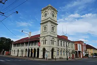In 1869 a single faced clock, facing Wharf Street, was installed in the third level of the tower. The Wharf Street loggia was enclosed in 1875–77 by contractors J and J Rooney to increase accommodation and improve lighting and ventilation. A further storey was added to the corner tower in 1879–80, allowing the installation of a four dialled clock and bells, which was officially started on 9 December 1879 (the clock was dismantled in 1935). The first country telephone exchange was opened in Maryborough in November 1882, and a new wing constructed to house the expanding operation in 1885, as well as the enclosure of the Bazaar Street loggia. As a result of the enclosure of both loggias, the ground floor offices were not protected from the summer heat. This necessitated the construction of a corrugated iron awning supported by cast iron columns over the Bazaar Street footpath and the attachment of cast iron framed corrugated iron sunshades to the first floor level windows on both facades. In addition, a timber-framed balcony replaced the sunshades to the first floor level of the postmaster's quarters in 1896. Internal alterations were undertaken in 1906 and 1925, and a separate building for the telephone exchange was added in 1948. The building underwent further additions and alterations, including the reopening of the Bazaar Street loggia, during the 1950s and 1960s.[1][2]