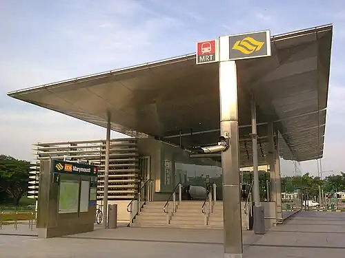 In June,[9] Contract C853 for the construction of Marymount station and its tunnels were awarded to the Taisei Corporation.[10] Construction started for Stage 3 stations in the third quarter of 2003 with expected completion by 2008 and cost of S$1.2 billion (2004) (US$709.96 million).[10] During construction, Marymount Road temporarily closed for realignment works on 10 February 2004. In July 2005, a public consultation exercise conducted by the Land Transport Authority (LTA) revealed that the majority of respondents preferred for the station to be called "Marymount" as it was easily identifiable compared to its alternatives such as "Shunfu" and "Pemimpin".[11] On 7 June 2008, residents of Thomson along with Advisor to Bishan-Toa Payoh North GROs Hri Kumar Nair, members of the Thomson CCC, and various grassroot leaders, got a preview tour of the station by the LTA, where they were shown non-public areas such as the ventilation and systems monitoring rooms.[12] Initially planned to be fully operational by 208, the Nicoll Highway Collapse on 20 August 2004 delayed operations for Stage 3 CCL stations to 2009.[13] On 28 May 2009, Marymount along with other Stage 3 stations opened, two days earlier to the expected 30 May date.[14][15]