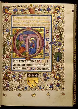 The anonymous master decorated a pocket-sized miscellany for Roberto Sanseverino in 1467–1468, now Bibliothèque de Genève, Comites Latentes 269.[2] He also decorated a copy of Augustine's The City of God that was later owned by Matteo Barresi and is now Lawrence, University of Kansas, Kenneth Spencer Research Library, MS G.1.[1] Two books of hours decorated by the master are known. One is the work after which he is called, the book of hours of Isabella of Clermont, wife and queen of Ferdinand I. It is now Houghton Library, Harvard University, Typ. 463.[4] The other book of hours is Walters Art Museum W.328.[1]