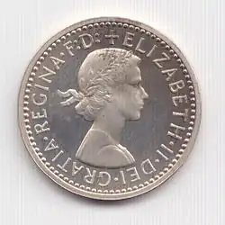 The original composition of the coins was sterling (0.925) silver. In common with all British silver coins, the fineness was reduced to 0.500 in 1921.[95][96] In 1947 silver was removed from all circulating British coinage in favour of cupronickel, but as it was felt to be inappropriate to strike Maundy coins in base metal, their fineness was restored to 0.925.[97] On Decimal Day, 15 February 1971, the pound sterling became decimalised, with 100 new pence instead of 20 shillings of 12 pence (240 pence) in a pound. No change was made to the design of the Maundy pieces, and all Maundy pieces, both pre- and post-Decimal Day, are by law deemed denominated in new pence, more than doubling the face value of the pre-1971 pieces.[97] The Maundy pieces continued to use the original obverse design for Queen Elizabeth II by Mary Gillick, although the bust of the queen on other British coins was repeatedly replaced as she aged.[2] At the time of decimalisation, the Royal Mint Advisory Commission recommended the retention out of affection for the Gillick design; this was accepted by the queen.[98]