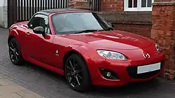 The MX-5 Sport Black is a limited edition of the MX-5 powered retractable hardtop (PRHT) with a 120 kW (160 PS) MZR-2.0L engine and Sport Tech equipment package, inspired by the Mazda MX-5 GT race car and built for the UK market. 500 examples were produced. It included a Brilliant Black powered retractable hardtop, black leather interior with contrasting 'sand' color stitching, Piano Black steering wheel and deco panel, and unique 'Black Limited Edition' exterior badging, uniquely numbered interior plaque and Limited Edition floor mats as well as dark 'gun metal' 17-inch alloy wheels and a limited-slip differential. Available body colors included Spirited Green metallic, Crystal White Pearlescent and Velocity Red mica.