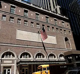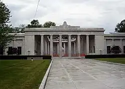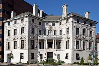 The firm retained its name long after the deaths of the founders. White was murdered in 1906, McKim died in 1909 and Mead retired in 1919. Kendall and Richardson divided most design responsibilities while Fenner took on the role of chief executive.[18] Architectural historian Mosette Broderick described the design partners thusly: Kendall as "hardworking, dull and mean," Richardson as "the best designer of the three."[19] This summation of Kendall's design skills is contradicted by his buildings, such as the Butler Institute of American Art (1919); his contemporaries considered him scholarly in the way that McKim had been.[20] The recollections of employees such as Royal Cortissoz, however, confirm that his behavior towards his colleagues and subordinates could be actively malicious.[21] Leland M. Roth identified the Racquet and Tennis Club (1918), designed by Richardson, as "the last and best work" of the decade following McKim and White's deaths. Richardson here combined Italian Renaissance precedents, such as the Florentine Palazzo Antinori, with modern functionalism.[22] The final two partners, Lawrence Grant White (1887 – 1956)–Stanford White's son–and James Kellum Smith (1893 – 1961), were admitted to the partnership in 1920 and 1929, respectively.[23] In its later years the firm maintained its commitment to quality materials and workmanship, but without its earlier creative abilities. In prior years the firm had been unfairly accused of being a "plan factory," a firm which executed generic, repetitive work as quickly as possible, but after about 1920 the comparison came to be seen as apt.[24][25]