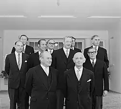 John Gorton became Prime Minister of Australia on 10 January 1968. He was chosen to lead the Liberal Party in place of Harold Holt, who had drowned in rough surf off the Victorian coast. William McMahon was then serving as Deputy Leader of the Liberal Party, but Country Party leader John McEwen ruled out maintaining the Coalition if McMahon became Prime Minister. McMahon as Treasurer had resisted McEwen's support for high levels of protection for manufacturing.[1] Defence and Australia's commitment to the Vietnam War was a prominent issue during the term of the Gorton government; funding for the arts was expanded, rates of pay were standardised between the men and women and the mining industry grew during the period. A policy of economic centralisation led to friction with State leaders and difficulties within the coalition. Gorton departed the office of Prime Minister on 10 March 1971 after a tied Liberal party room vote of confidence in his leadership.[2]