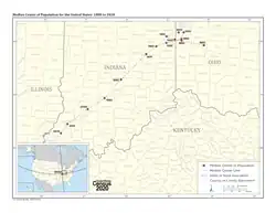 During the 20th century the median center of U.S. population moved roughly 180 miles (290 km) southwest, from a location in Randolph County, Indiana to a location in Daviess County, Indiana. The majority of this southwest shift happened in the second half of the century, as the center shifted within a narrow circular band between 1900 and 1950 – all within roughly 25 miles (40 km) of the 1900 starting point in Randolph County.