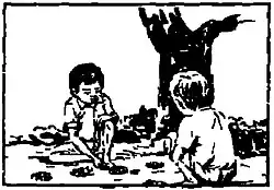 Children play with khung or khoong tops (ꯈꯨꯡ)[6] by tying a string around it and then pulling it to make it spin on the ground. The khung top spins quickly and stays balanced on its pointed end. Children may try to keep it spinning for a long time or make it spin in different ways. This game is usually played in open spaces where the khung top can spin freely.[2]