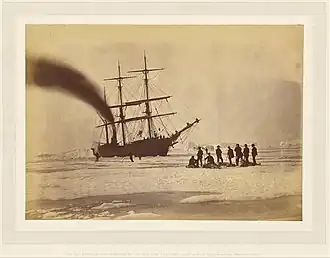 1869 photograph of a steamer and a party of hunters in Melville Bay.
