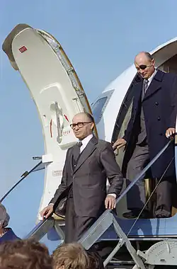 In the following years, Begin failed to gain electoral momentum, and Herut remained far behind Labor with a total of 17 seats until 1961. In the 1965 Israeli legislative election, Herut and the Liberal Party united to form the Gahal bloc under Begin's leadership, but the merger prompted several Liberal MKs to split and form the Independent Liberals and Gahal failed to gain seats in the election, or make up the seats it lost from the Independent Liberal defection. In 1966, during Herut's party convention, he was challenged by the young Ehud Olmert. The opposition group within Herut, however, sensed that Begin's leadership position was too strong to challenge directly and concentrated on winning control over the party organization. They won overwhelming victories in all votes for the composition of party institutions. Begin responded to these challenges by announcing his retirement as party chairman and suggesting he would also resign seat in the Knesset. Begin's move mobilized delegates in support of him, but the party convention ended without a party chairman being elected; the chair would be vacant for eight months. Internal opposition to Begin' leadership came to a head a month after the convention, when Haim Amsterdam, an assistant to one of the opposition leaders, Shmuel Tamir, published a devastating attack on Begin in Ha'aretz;[45] this led to the suspension of Tamir's party membership.[46] The leaders of the opposition then established a new party in the Knesset, the Free Center, with the loss of three seats for Herut. After this revolt, Begin reversed his decision to retire and returned as party chairman in February 1967.[47][48][49]