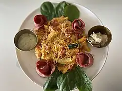 Sucuk, a dried salami-like sausage, can be added to the pan after the peppers have softened.[10] This adds some flavor to the oil; the sucuk can be removed from the pan before the tomatoes are added to avoid overcooking, but this is not necessary. The tomatoes become very soft and the mix not be too watery when the eggs are added. The eggs may be beaten together with salt, pepper and any desired fresh herbs or added directly to the pan.[11] If pastırma is being used, it is added to the pan with the eggs.[12] Kaşar cheese or white cheese may optionally be added on top of the eggs just before they finish cooking, along with a garnish of fresh herbs or scallions.[10] It is usually served in the pan in which it is cooked, a double-handled cooking pan known as sahan, together with fresh bread.[13]