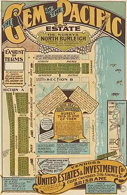 Circa 1924, 70 allotments were advertised as "Mermaid Beach Estate" located at Mermaid Beach and Broadbeach to be auctioned by R. G. Oates Estates. The estate map has 3 estates for sale at Mermaid Beach and Broadbeach. The estates were divided in two by the "New Coastal Road" running through the Gold Coast.[6][7]