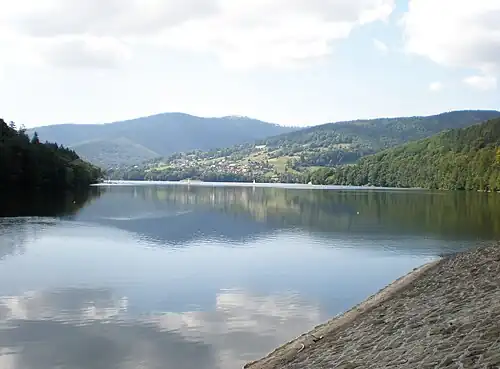 Lake Międzybrodzkie on the Soła river at the foot of Międzybrodzie Bialskie village, located 30 kilometres (19 mi) south of Oświęcim about half-an-hour drive along Road DW 948