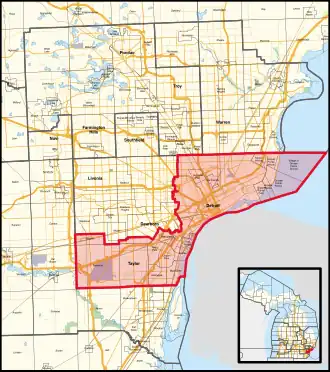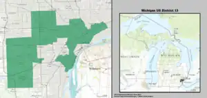 The district includes portions of Detroit and some of its suburbs, and from 2013-2023, was the only congressional district in Michigan to be contained within a single county.[3] District boundaries were redrawn in 1993, 2003, 2013, and 2023 due to reapportionment following each respective census.