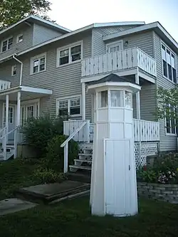 Willson and his group decided to split the property into 23 lots and create a residential beach association, requiring that all leaseholders build on their land within two years or else relinquish their leases.[5] Combined with the stipulation that all buildings constructed had to be worth at least $600, the result was the creation of a number of comfortable and fairly simple two-story cottages. In 1895,[10] the property's leaseholders decided to name it "MICH-ILL-INDA", in reference to the three states from which they hailed: Michigan, Illinois, and Indiana.[4][5]