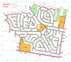 Middle Park is bounded to the north by the McLeod Country Golf Club, to the West by Baronga Street and Horizon Drive, Lalina Street and Macfarlane Street, to the south by Sumners Road and to the east by Estate Road and Beanland Street.[5]