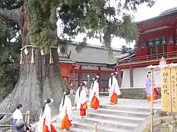When a miko is serving a Shinto ritual or performing kagura (a shrine maiden dance), she wears a chihaya over the top.[13]