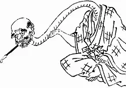 While mikoshi-nyūdō depicted as a yōkai with giant characteristics exists, the mikoshi-nyūdō that brings to mind the long-necked rokurokubi depicted in play images in the Edo period are certainly not strange.[17] There are those who think that they are related to the rokurokubi,[17] and since the rokurokubi of legends are frequently female, they are sometimes pointed out as examples of male rokurokubi.[18] The length of its neck has been exaggerated over the passage of eras, and in the late Edo period, it has become standard for its neck to be long and thin, and for its face to have three eyes.[9] In many kusazōshi that had a theme on yōkai, they are also depicted as having a characteristic long neck, and from having an appearance with such impact, they almost always appear as the chief yōkai.[18][19]