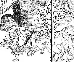 Mikoshi-nyūdō (見越し入道 or 見越入道) is a type of bald-headed yōkai "goblin" with an ever-extending neck. In Japanese folklore and Edo period (1603–1868) kaidan "ghost story" texts, mikoshi-nyūdō will frighten people who look over the top of things such as byōbu folding screens.[1] The name combines mikoshi 見越し (lit. "see over") "looking over the top (of a fence); anticipation; expectation" and nyūdō 入道 (lit. "enter the Way") "a (Buddhist) priest; a bonze; a tonsured monster".[2]