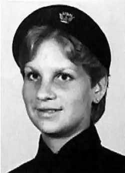 An Army officer wearing black female beret with Officer Cap Device, c. 1975[90]